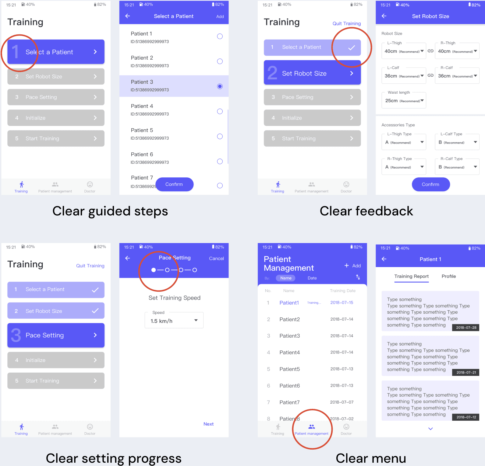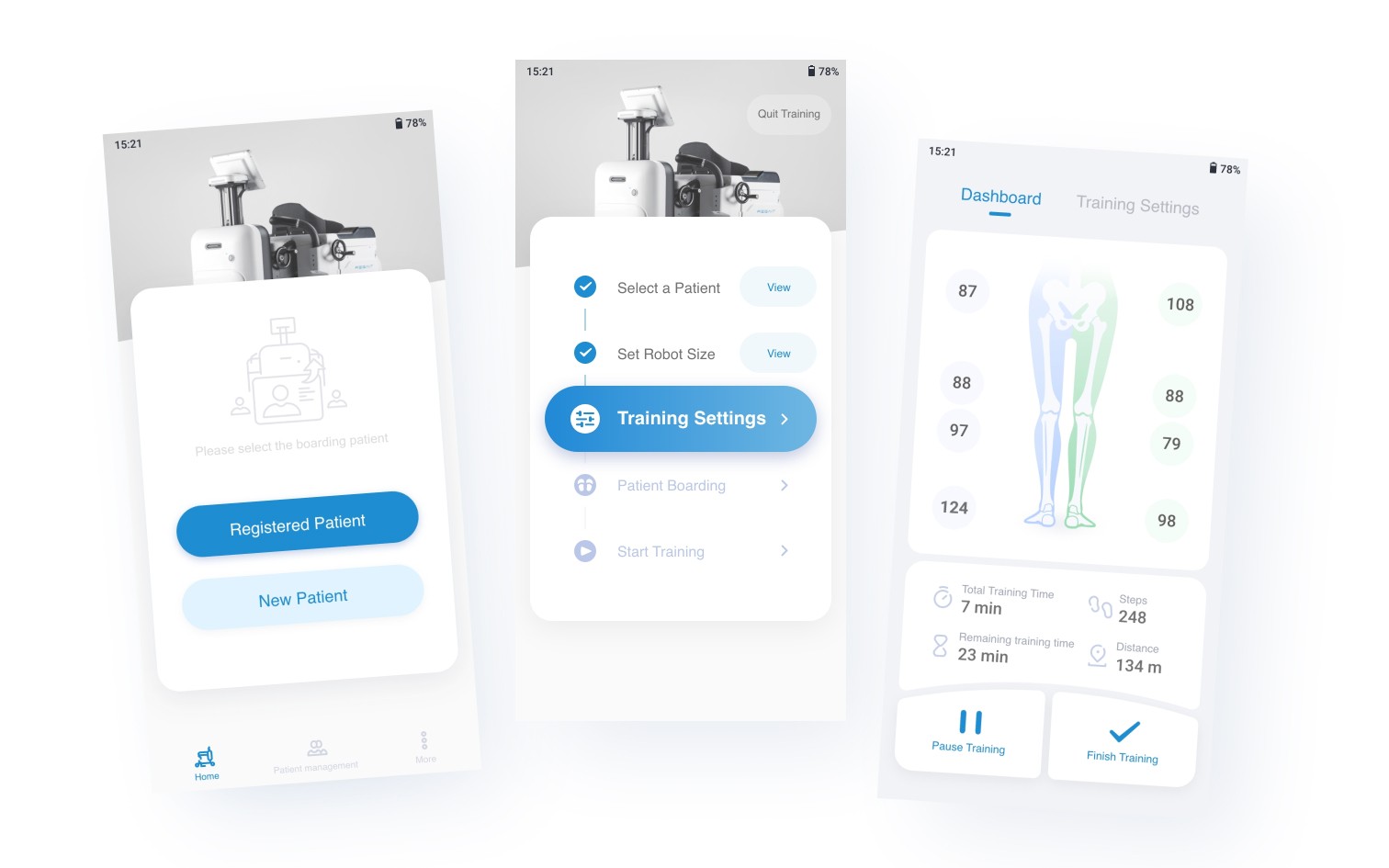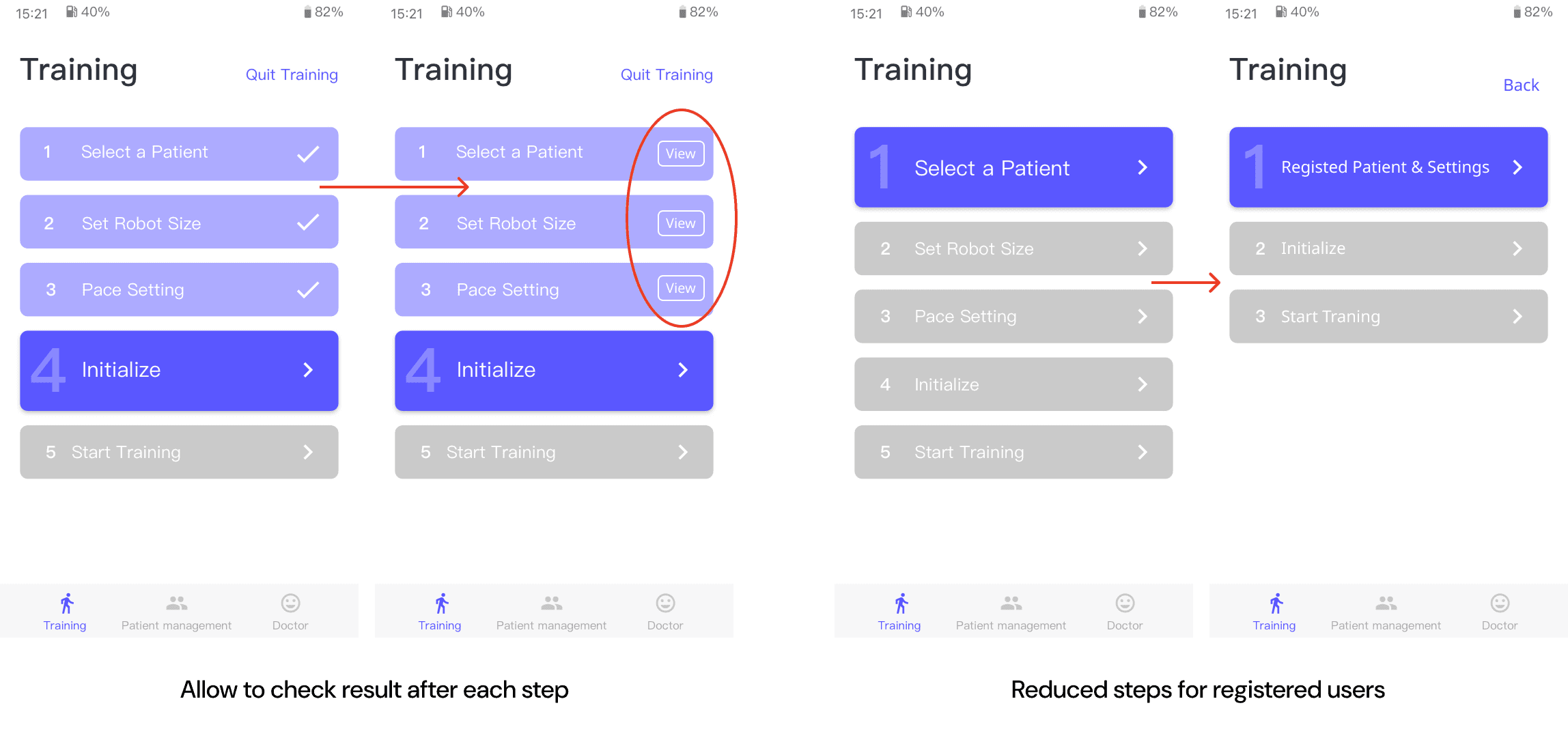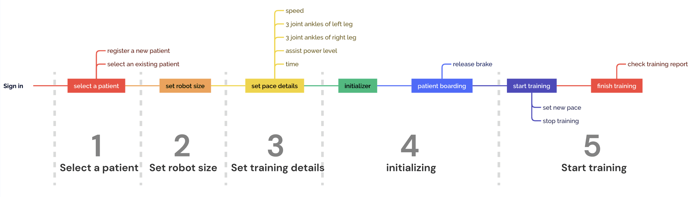 I designed a linear 5-step training flow — Select Patient → Set Robot Size → Set Training Details → Patient Boarding → Start Training — so users always know exactly where they are and what comes next.