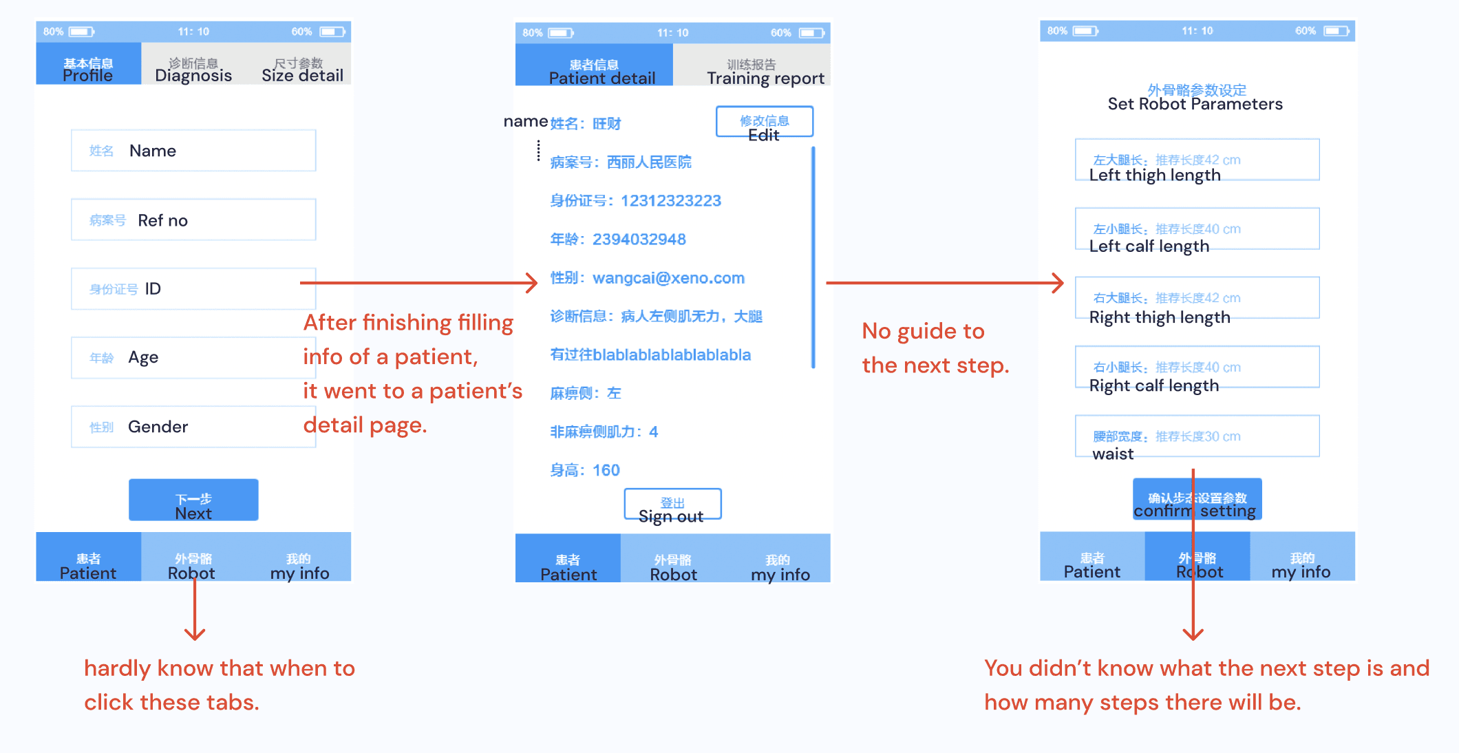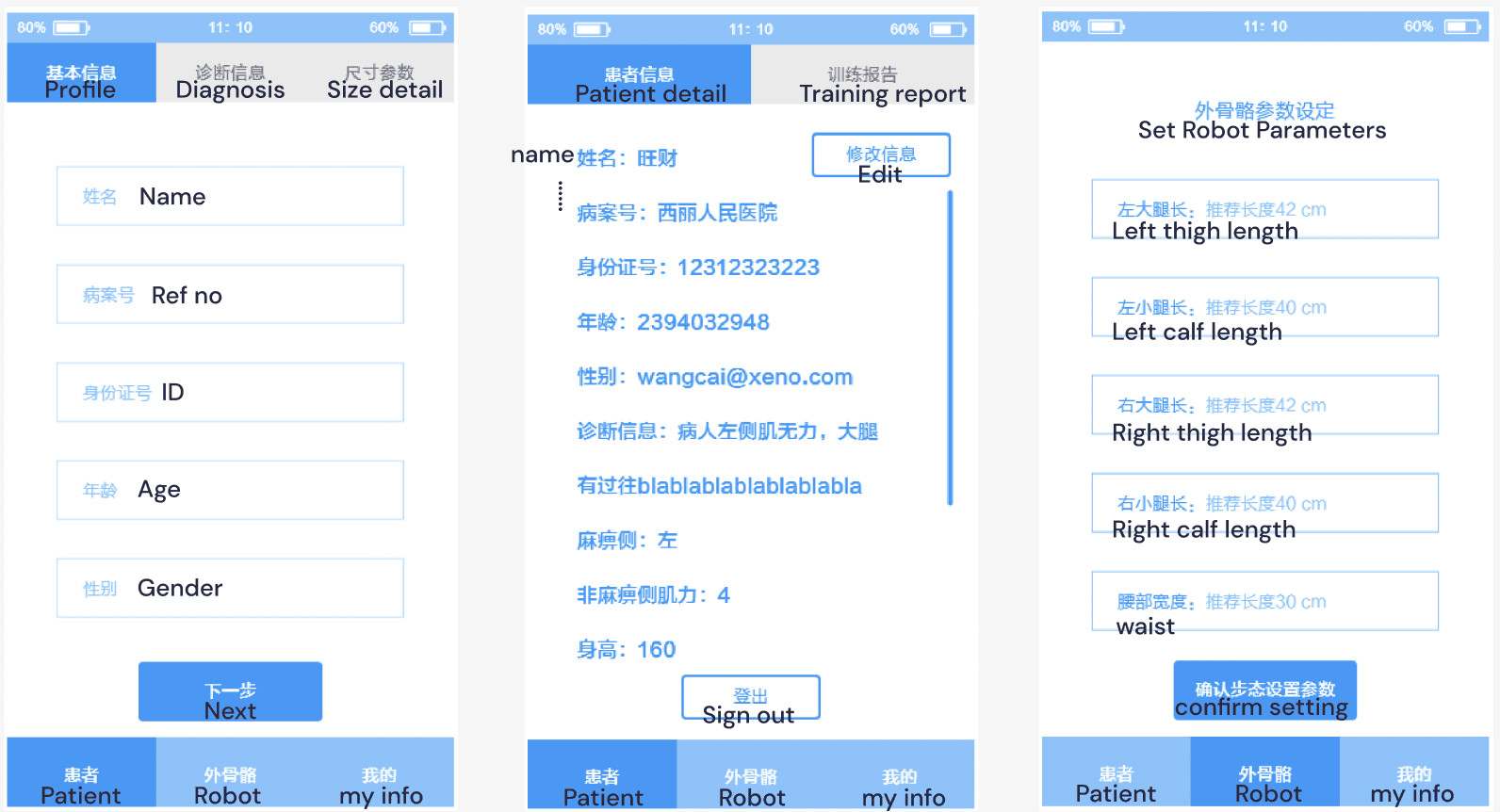 The interface served two simultaneous user groups: rehabilitation doctors and patients. Doctors work in hospital rehab departments, managing body measurement inputs and adjusting training parameters (joint angle, force) for each session. Patients are predominantly middle-aged stroke survivors experiencing partial or full loss of leg mobility.The product contains two interfaces — a Controller app operated by rehabilitation doctors, and a patient-facing tablet displaying real-time training scores.
